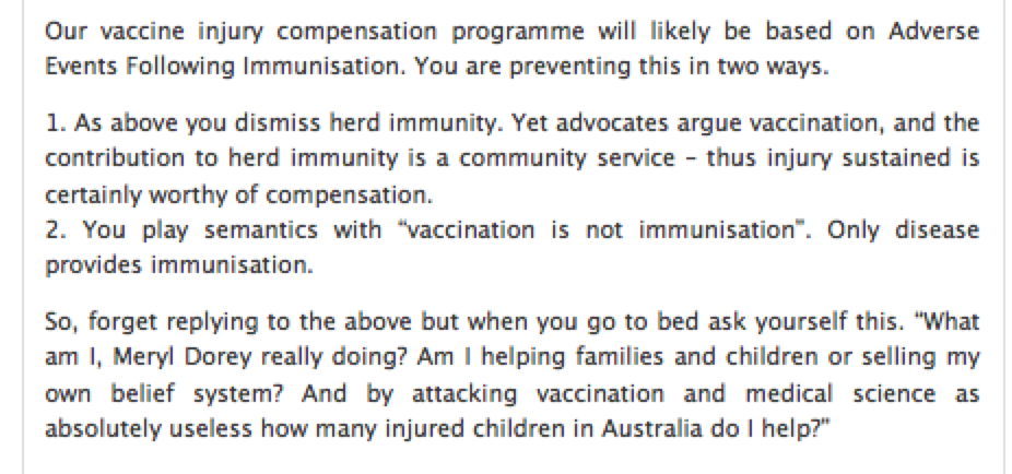 But what of my comment? Why did Meryl not publish it? I actually said it is an abuse of the international right to health that Australia has no vaccine injury compensation programme. Surely Meryl can’t disagree. Perhaps it was the facts and challenges I included. What is unusual is that I hadn’t read the comments on Ella not the predisposition admitted by her mother. I feel for this family and I am appalled that Australia has no compensation scheme for similar injuries. I also call Dorey’s bluff on vaccine injury.