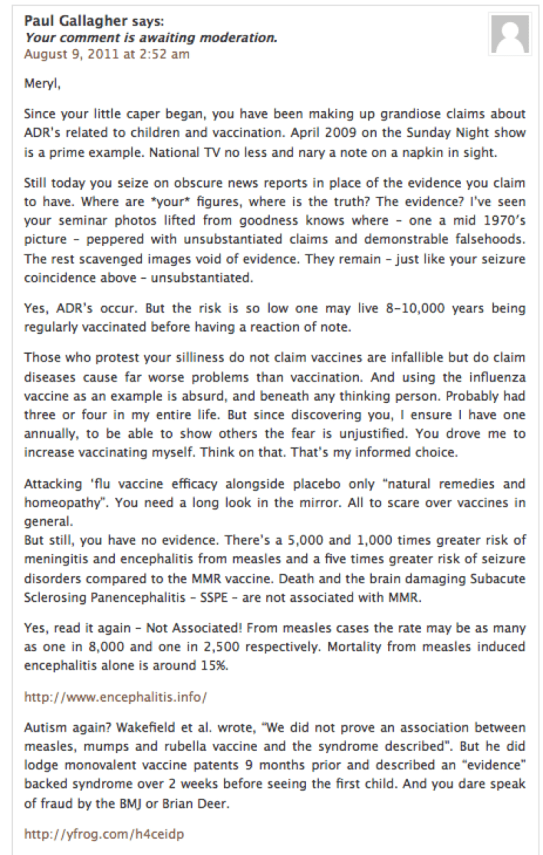 Update August 4th comment pt.1 Published August 10, 2011 at 926 × 1460 in Meryl Dorey: Free Speech champion who censors the truth Next »