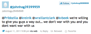 Interestingly enough they did have their suspect under investigation. No better proof that they’d had a little chat than these different toned tweets, on August 11. The registering and deleting of accounts is reflected in the random numbers on his Twitter handles;