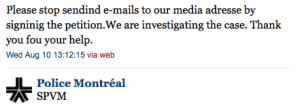 Despite complaints being filed, it wasn’t until journalist William Raillant-Clark became involved that things escalated. He tweeted about to get a handle on things and decided “this is unacceptable to me”. Phil Plait confirmed his complaints had gone nowhere. Unhappy with police apathy Raillant wrote a piece on Tumblr about police doing nothing as Montrealer threatens to murder science journalists. Skeptic, Kyle VanderBeek works at change.org, and spotted an opportunity on his work desk. He got a petition going which was retweeted over 500 times. The petition was set up so each signature meant Montreal police received an email. Eventually they could bear no more.