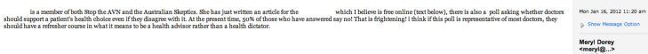 You can see where this is going. Context is meaningless. Actual incidence and significance of adverse events or package insert information works against all that the AVN stand for. As I wrote last time, “This particularly immoral intent of Meryl Dorey’s overall scheme to sabotage vaccination in Australia is born of connivance of such intellectual paucity as to demand it be placed in context”.