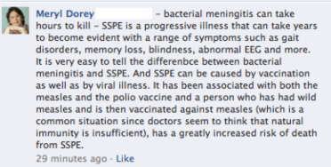 On a final note, it is outrageous for Dorey to be feigning concern over SSPE. There is only one answer to tackle SSPE: the elimination of measles via vaccination. Even then it’s estimated that a lag of up to 20 years or more will follow in which latent SSPE from wild measles will continue to emerge.