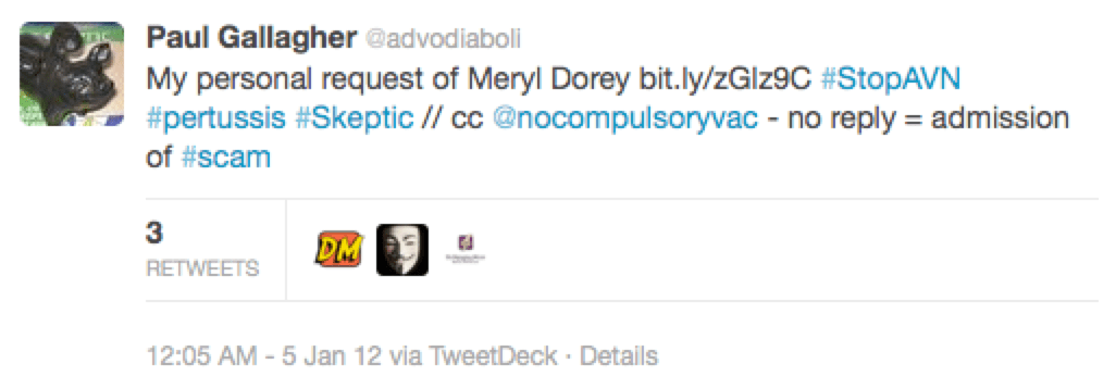 Pertussis Tweet Published January 14, 2012 at 1026 × 346 in The Silence Has Fallen: will the real Meryl Dorey please stand up « Previous Next »