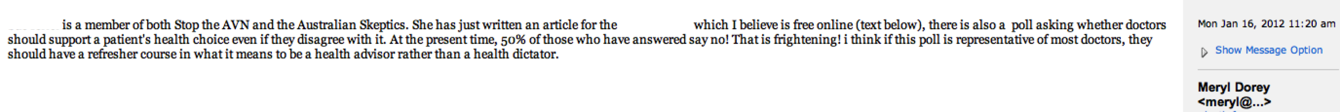 Dorey invents a skeptic Published January 23, 2012 at 2750 × 230 in Meryl Dorey claims that Australian Skeptics suppress free speech – Why? Next »