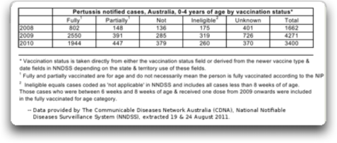 Firstly as the table informs us “fully vaccinated” does not necessarily conform with fully vaccinated under the National Immunisation Program. Ineligible cases between 6-8 weeks of age that had received one dose in 2009 are included in “fully vaccinated”. Both these facts artificially inflate the “fully vaccinated” category.