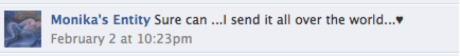 Monika writes on Facebook and elsewhere using bizarre grammar and spelling. We get a strange contrived pixie sing-song lilt about the universe, karma, the law of attraction and nasty things eventually happening to anyone who challenges her. Monika apparently has some explaining to do.