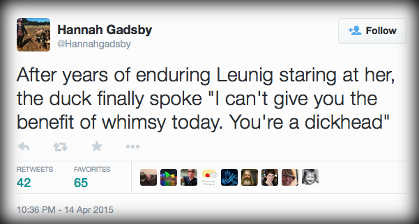 After years of enduring Leunig staring at her, the duck finally spoke “I can’t give you the benefit of whimsy today. You’re a dickhead”.