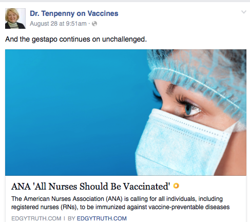The specificity of the Gestapo role is touched on above. They existed to solidify Nazi rule and acted to identify and eliminate any potential opposition to Nazi supremacy. Tenpenny strongly likens a call by the American Nurses Association to have their members protected, and to protect their patients from vaccine preventable disease to the activity of a dictatorship. Perhaps she sees the ANA as an enforcement arm of Fascist health authorities.