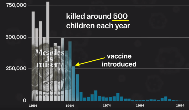 First however I want to draw attention to the screenshot from the video. Note the high number of fatalities. In the USA measles killed around 500 children per year during the 1950’s. Also pay attention to the drop in measles cases after the 1963 introduction of the measles vaccine.