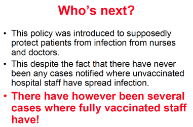 Has the vaccine caused this transfer? No. Is it in any way responsible for the transfer? No. But Meryl wants her audience to believe vaccinated staff will make unvaccinated patients sick. Vaccinating staff against influenza has been shown to halve patient mortality, according to studies well before Dorey drew up these slides. Clearly Dorey is misleading her audience to create a fallacious impression of a life saving policy.