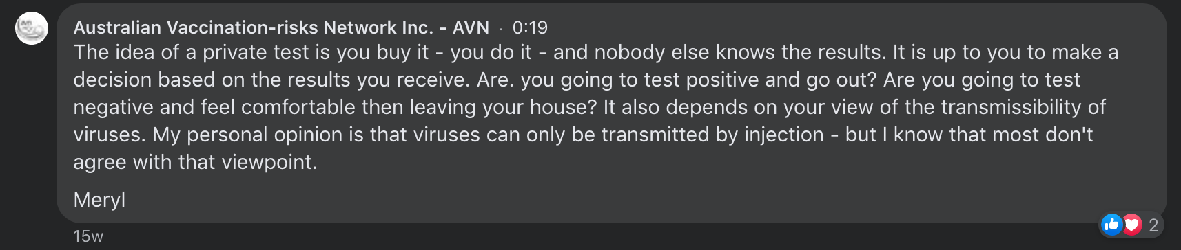 There’s little point restating the AVN’s exploitation of those who have lost a loved one to death or injury and are vulnerable to the ‘vaccine injury’ profit machine. You can delve into the reality behind the scheme here and marvel at the scope of the delusion on sale here. Meryl Dorey scored extra points for claiming in April that her personal opinion was that viruses could only be transmitted by injection, then deleting the comment once it was made public.
