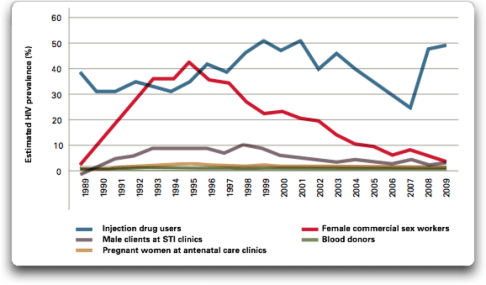 Thailand has impressively cut HIV infection in workers in the famous tourist attracting sex industry from 40% in the mid 1990’s to around 5% today. This pulled male clientele infection rates down in parallel. At the same time fierce drug war tactics led to 2,500 “death squad” murders in 2003 and HIV is up to 1 in 2 IDU in some regions. A comparison of different demographics for HIV infection is compelling: