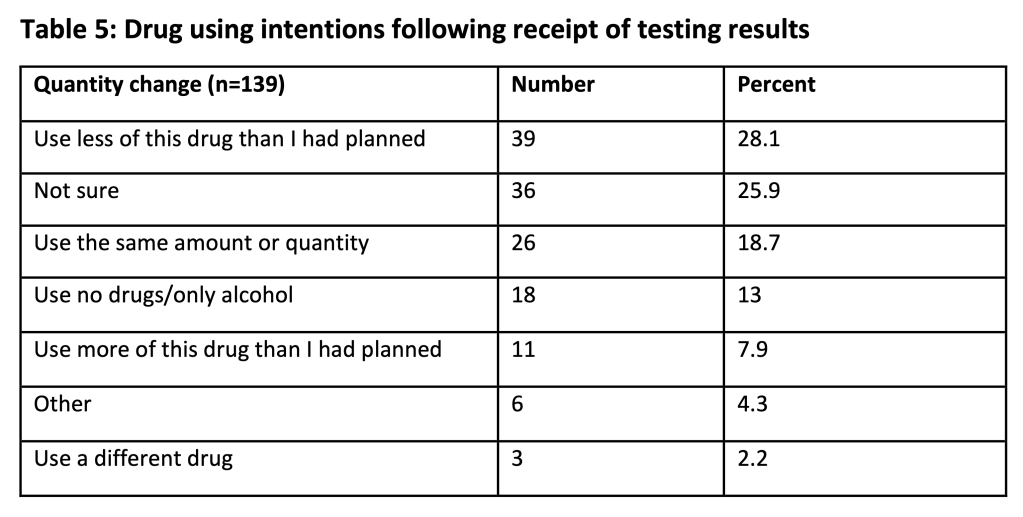 When read in context we see that patrons intent to use drugs did not dramatically change, but their intent to engage in harm reduction behaviour notably increased. Eg, also on p.33 (bold mine); Many interviewees reported that the quantity of drugs that they intended to use did not change after testing, as the drug was identified to be what they expected. And, Many interview patrons indicated that their intention to use did not change, but their intention to engage in harm reduction behaviours did increase. Also, this and other evaluations have found non-concordance between patrons’ expectation of what a substance is and what a substance is identified to be, commonly leads to reduced intention to take that substance.