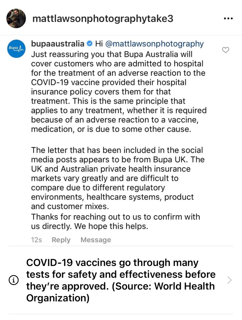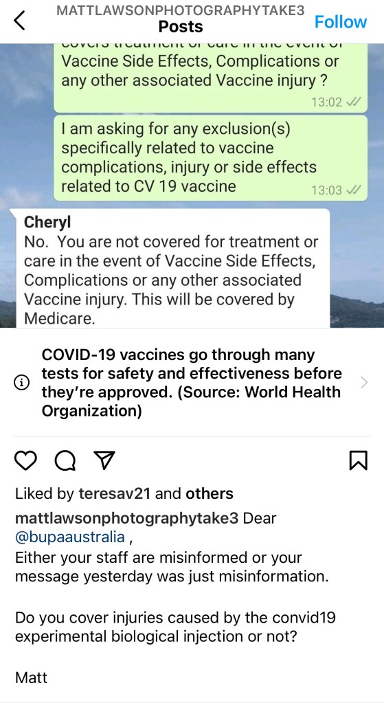 In the first image we see Bupa’s reply to anti-vaccine activist and COVID conspiracy theorist Matt Lawson, on social media. It outlines quite clearly that treatment covered by policy is available for adverse reactions post COVID-19 vaccination. In the next we see Lawson has engaged in a chat with ‘Cheryl’ from Bupa and presented this to Bupa on Instagram to challenge the prior response. The last screenshot was uploaded by Elle Salzone in the thread we’re discussing as another example of an insurance company denying cover to injury or reaction after COVID-19 vaccination.