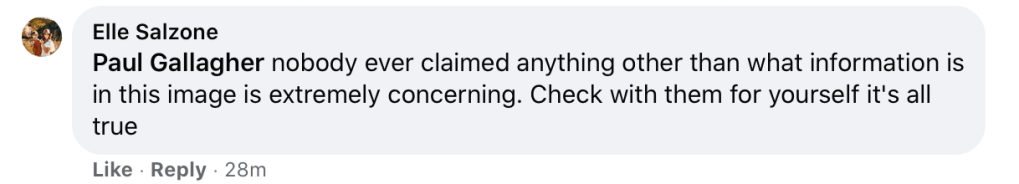 Sadly some Facebook visitors to Elle Salzone’s page, who take her word on trust, are absolutely convinced of the dark side as this reply to me, packed with five pieces of misinformation, confirms. [Note – this is not from Salzone but a vulnerable visitor].