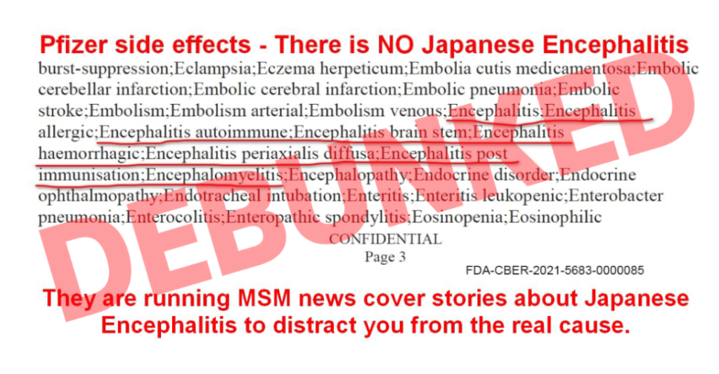 The Pfizer report was also used by Senator Gerard Rennick to spook Australians with respect to vaccine safety. The problem with their approach goes deeper than Kelly’s unfortunate citation of Children’s Health Defense. Just like VAERS and the UK Yellow Card reporting system the Pfizer document relies on passive reporting. Causally speaking the data are unverified. However, again like VAERS and the UK Yellow Card system, the reports will be taken seriously and followed up if events occur more frequently than before the vaccine was distributed. As if on cue to reinforce this point came the absurd claims of Japanese Encephalitis actually being a side effect of the Pfizer vaccine (see p.32 for original).