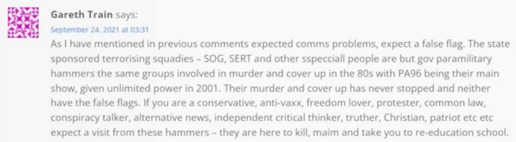 On the topic of consequences however, Australians were shocked when Nathaniel, Gareth and Stacey Train murdered two young police officers and a neighbour almost certainly as a result of their involvement with, and conduct as, online conspiracy theorists. Their lifestyle indicated they’d chosen to live isolated, and had internalised paranoid beliefs about government intentions. Gareth Train had contributed to different forums where conspiracy theories and sovereign citizen ideology thrive. The pandemic with its consequent restrictions and mandates likely exacerbated his thinking, but Train was no newbie. Click through the sample below: