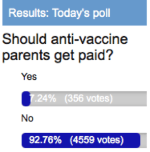 They ran a poll asking “Should anti-vaccine parents get paid?”. The results are quite in line with national vaccine rates. In fact they err toward more fully vaccinated Aussies supporting the payment for vaccine objectors.