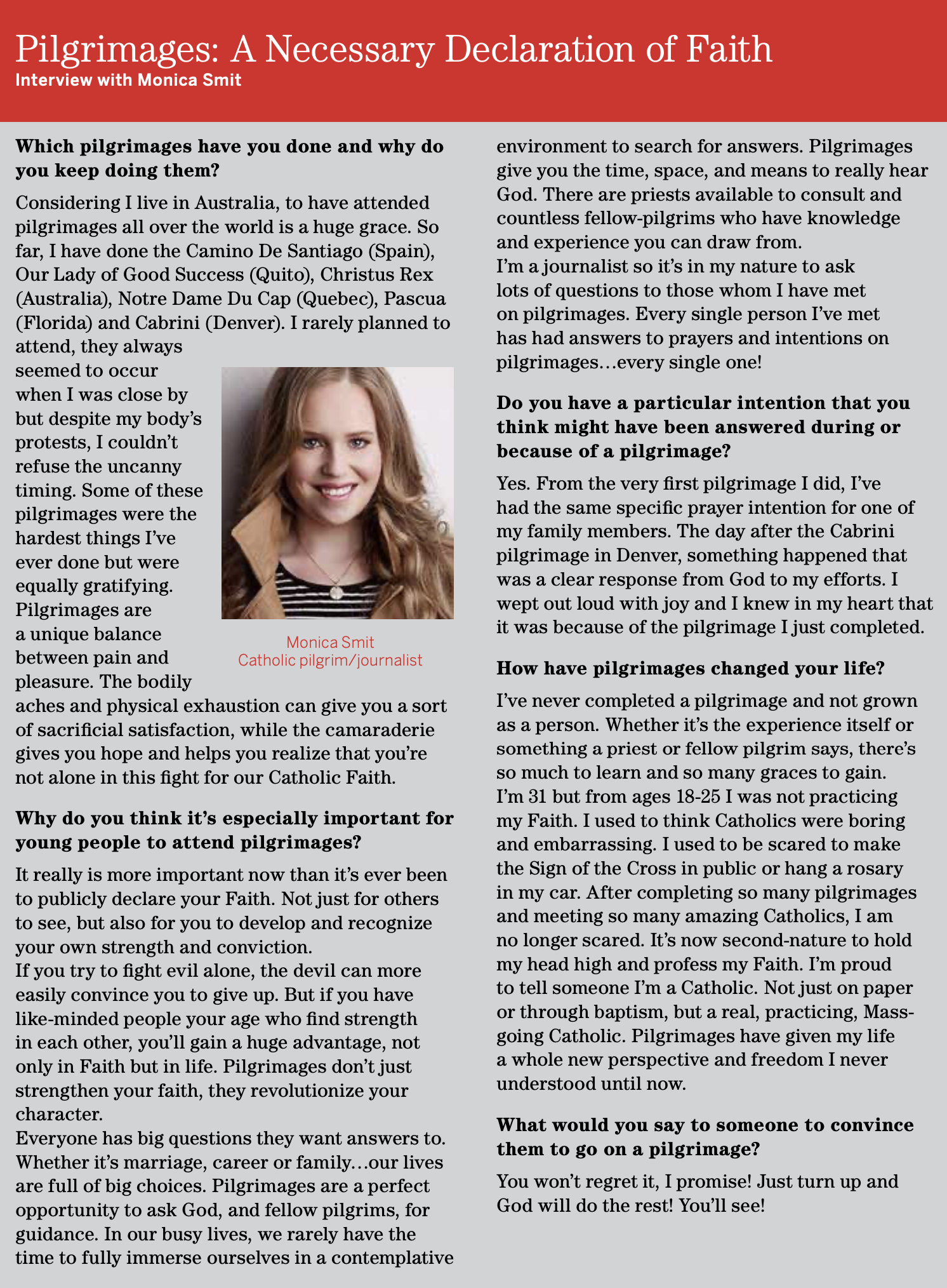 She also describes herself as a “Catholic pilgrim”. Following the Journalism menu to Catholic one finds a Regina Coeli Report in PDF featuring an interview with Smit on pilgrimages. Smit talks about God, the devil and evil. She references the fight for the Catholic faith and getting a “clear response from God to my efforts” for which she “wept out loud with joy”. Asked what she would say to convince someone to go on a pilgrimage she answered.