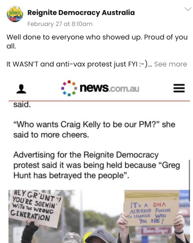 Smit kept drawing attention over 2020 and into 2021. She would attend protests and have herself filmed arguing with police over her right not to wear a mask, because she was a journalist. As noted above yesterday she was vocal at a protest outside the office of Federal Health Minister Greg Hunt. Channel 7 reported on the event. In one bizarre post on the RDA site today is a screenshot of her message that, “It WASN’T and (sic) anti-vax protest just FYI”. In the shot is an image of a woman holding a sign that reads, “It’s a DNA altering poison to change who you are!”.