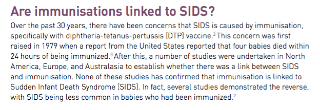 The document is an excellent publication covering the evidence and recommendations that apply to reducing SIDS. On page three the topic of Immunisation is addressed: