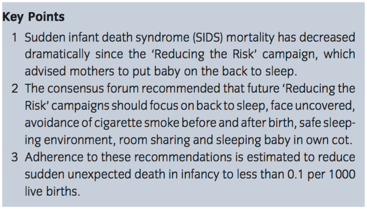 October 2010 saw the Scientific consensus forum to review the evidence underpinning the recommendations of the Australian SIDS and Kids Safe Sleeping Health Promotion Programme [PDF]. This Position Paper is published in the Journal of Paediatrics and Child Health [doi:10.1111/j.1440-1754.2011.02215.x]