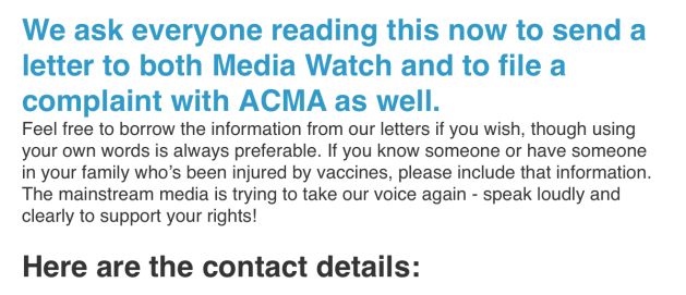This was confirmed a number of times during last year’s Vaxxed II bus tour. Despite promises to metaphorically storm the Bastille, and literally die or be free Dorey and Hafemeister meekly complied with requests to move their elaborate show elsewhere. Without exception. Without as much as a shaken fist. The promised revolution shrivelled to behind keyboard attacks on Lord Mayors, councillors and business owners who had dared “suppress” them. AVN members were and are constantly exploited in these endeavours. They are fed contact details of targets and often provided with a template response. Abusive tweets and sabotage of Facebook pages is the norm. Accepting that these responses are excessive is not something the AVN does.