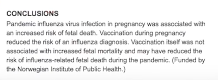 Quoting from the video, “There are no studies that show the influenza vaccine can cause miscarriages or stillbirths. An independent study has actually shown that the flu shot can decrease the risk of a miscarriage or stillbirth”. A screenshot [3min 20] from the New England Journal of Medicine, Jan. 24 2013 follows showing an abstract summary of Risk of Fetal Death After Pandemic Influenza Virus Infection of Vaccination. Conclusion as follows:
